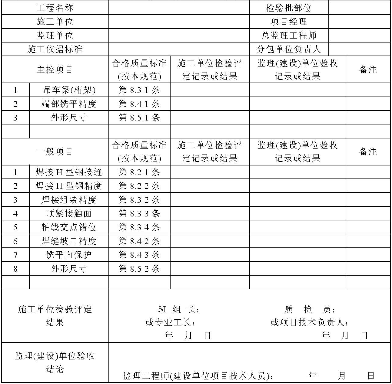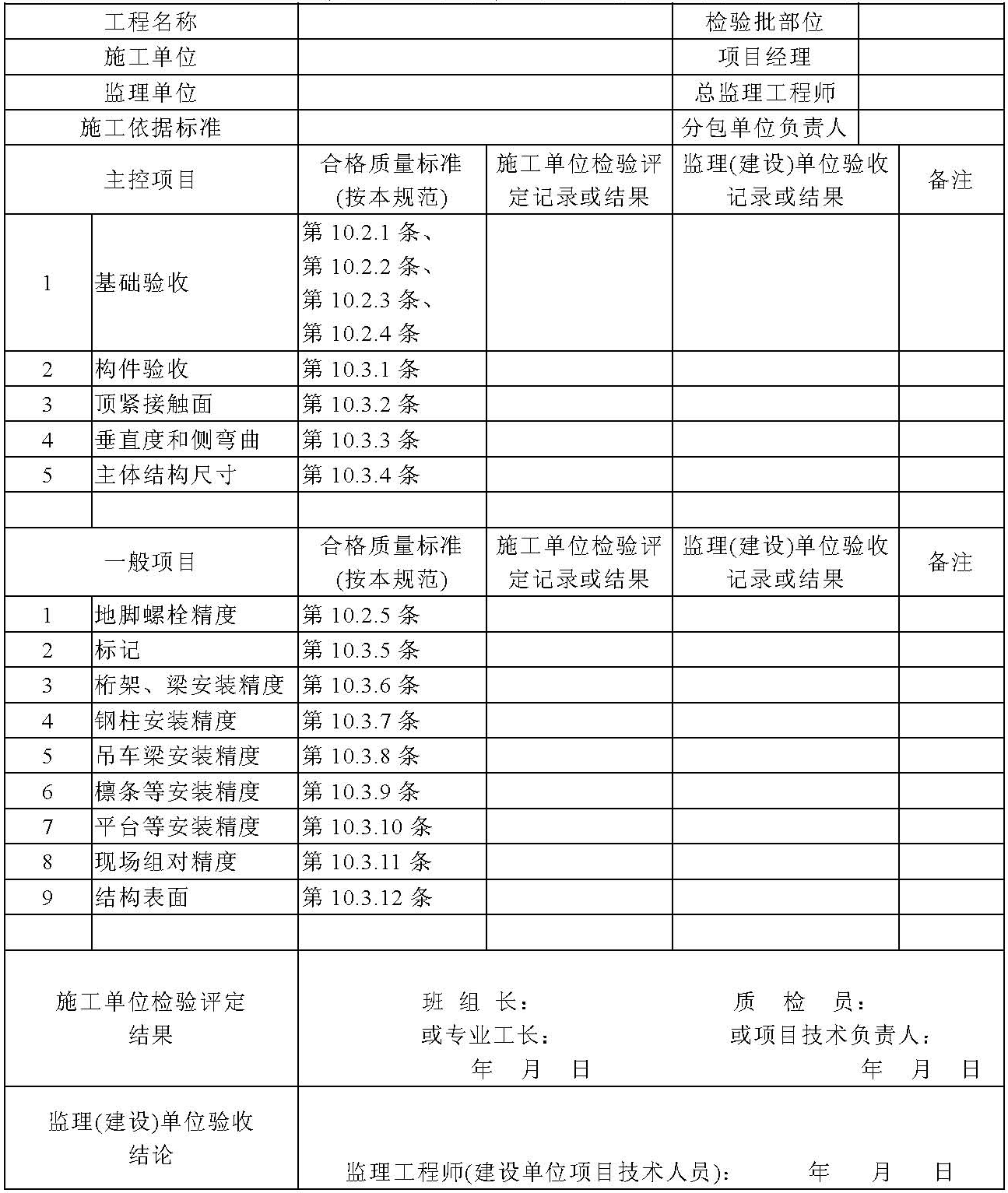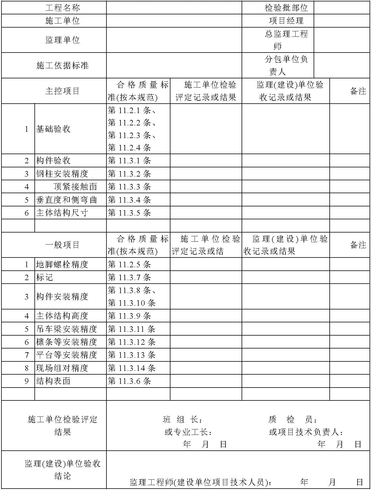 J.0.8 鋼結(jié)構(gòu)(單層結(jié)構(gòu)安裝)分項(xiàng)工程檢驗(yàn)批質(zhì)量驗(yàn)收應(yīng)按表J.0.8進(jìn)行記錄。