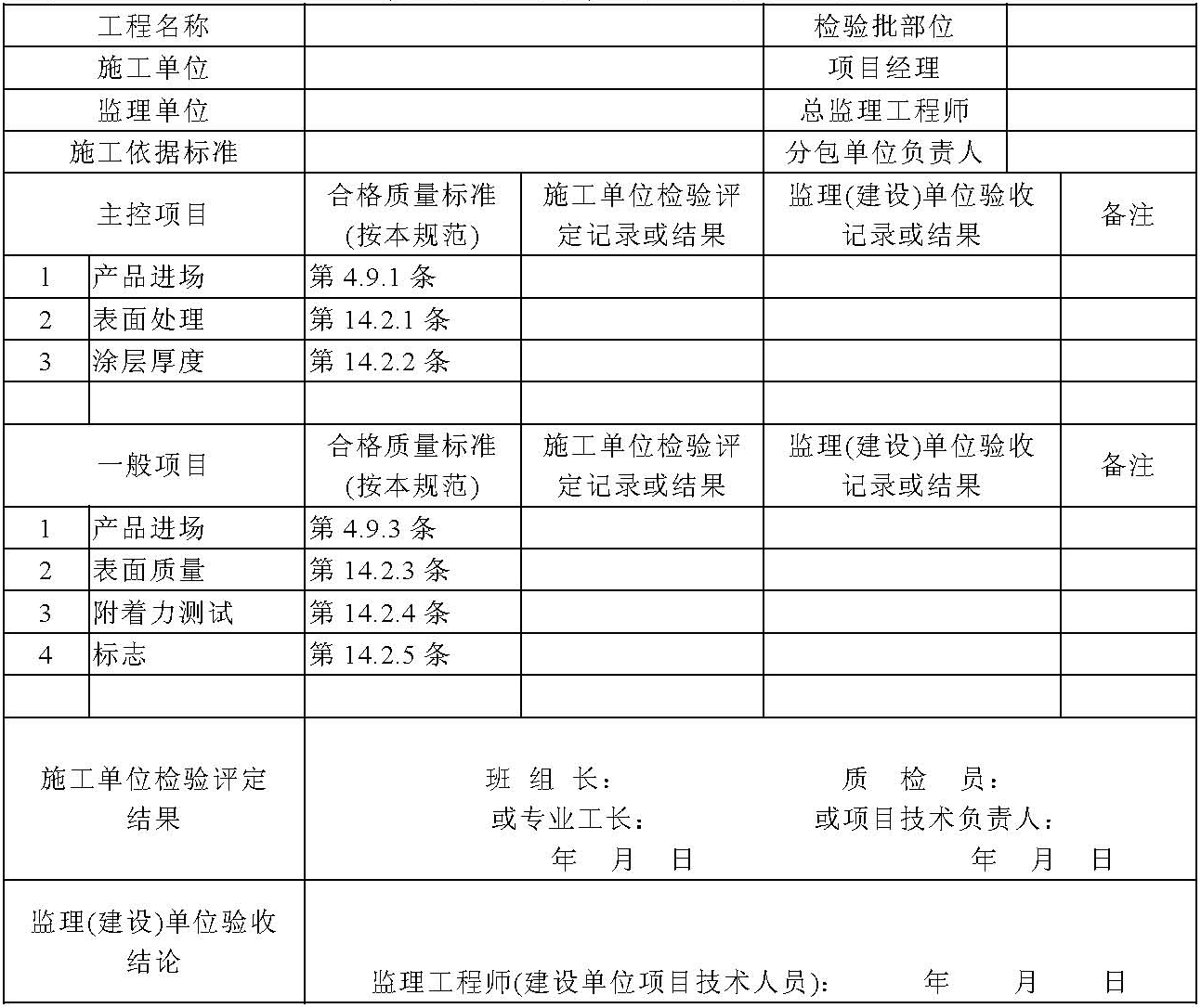 J.0.13 鋼結(jié)構(gòu)(防火涂料涂裝)分項(xiàng)工程檢驗(yàn)批質(zhì)量驗(yàn)收應(yīng)按表J.0.13進(jìn)行記錄。