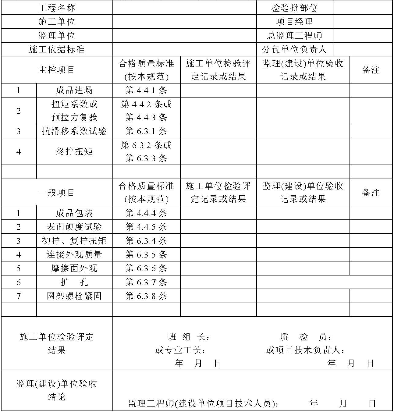 J.0.4 鋼結(jié)構(gòu)(高強(qiáng)度螺栓連接)分項(xiàng)工程檢驗(yàn)批質(zhì)量驗(yàn)收應(yīng)按表J.0.4進(jìn)行記錄。