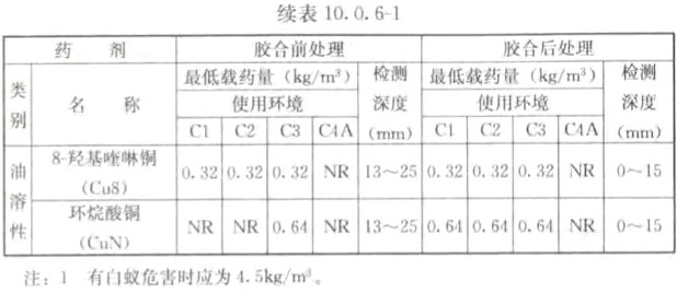 10.0.6 膠合木結(jié)構(gòu)宜在化學(xué)藥劑處理前膠合,并宜采用油溶性防護(hù)劑以防吸水變形,必要時(shí)也可先處理后膠合。經(jīng)化學(xué)防腐處理后在不同使用環(huán)境下膠合木構(gòu)什的藥劑最低保持量及其透入度,應(yīng)分別不小于表10.0.6-1和表10.0.6-2 的覘定。檢測(cè)方法應(yīng)符合本規(guī)范第10.0.5條的規(guī)定。