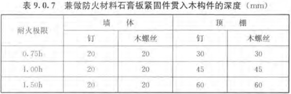 9.0.7 墻體和頂棚采用石膏板(防火或普通石膏板)作覆面板并兼作防火材料時(shí),緊固件(釘子或術(shù)螺栓)貫入木構(gòu)件的深度不應(yīng)下于表9.0.7的規(guī)定。
