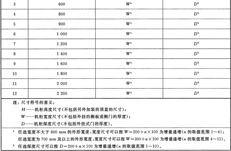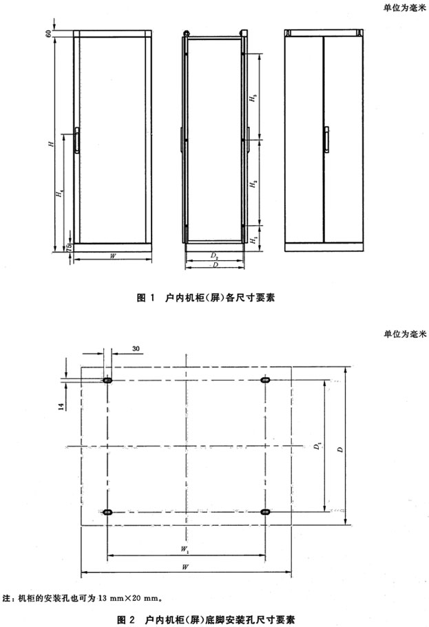 戶內(nèi)機(jī)柜(屏)各尺寸要素見圖1和圖2,戶外機(jī)柜各尺寸要素見圖3。對(duì)于有特殊要求的機(jī)柜,宜參照GB/T 19290.3-2008(戶內(nèi)機(jī)柜)和GB/T 19183.3-2003或GB/T 19183.2-2003(戶外機(jī)柜),由制造廠與用戶商定。
