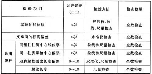 3.0.3 構(gòu)支架組立前,應(yīng)對(duì)基礎(chǔ)軸線(xiàn)和標(biāo)高、地腳螺栓位置等進(jìn)行檢查,并應(yīng)符合下列要求: