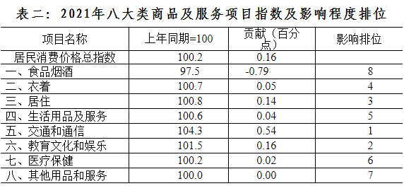 2021年,巴中CPI中的“八大類”商品和服務(wù)價格指數(shù)呈“六漲一降一平”。其中,交通和通訊類上漲4.3%、教育文化和娛樂類上漲1.5%、居住類上漲0.8%、衣著類上漲0.7%、生活用品及服務(wù)類上漲0.6%、醫(yī)療保健類上漲0.2%;食品煙酒類下跌2.5%;其他用品和服務(wù)類持平。(見表二)(四川?。┌椭惺?021年居民消費價格走勢分析報告