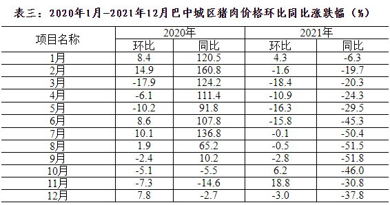 3.豬肉價格連續(xù)下降。2021年,巴中城區(qū)豬肉價格下降37.8%,對CPI的下拉作用約為1.11個百分點。從月度同比來看,從上年10月份巴中豬肉價格下降5.5%,扭轉(zhuǎn)了連續(xù)23個月的上漲行情;今年以來,受上年同期基數(shù)較高以及生豬出欄逐步恢復(fù)、豬肉市場有效供給量增加等因素影響,豬肉價格呈持續(xù)下行態(tài)勢嗎。2021年1月—12月,豬肉價格同比分別下降6.3%、19.7%、20.3%、24.3%、29.5%、46.3%、50.4%、51.5%、51.8%、46%、30.8%和37.8%,其中2021年6月—10月豬肉價格同比降幅超45%。(見表三)(四川?。┌椭惺?021年居民消費價格走勢分析報告
