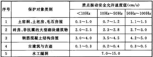 3 選取建筑物安全允許振動(dòng)速度值時(shí),應(yīng)根據(jù)建筑物的重要性、建筑質(zhì)量、新舊程度、自振頻率、地基條件等因素;選取隧道、巷道安全允許振動(dòng)速度值時(shí),應(yīng)根據(jù)建筑物的重要性、圍巖狀況、斷面大小、埋深、爆破方向、地震振動(dòng)頻率等因素;非擋水的新澆筑的大體積混凝土的安全允許振動(dòng)速度值,可按本表給出的上限值選??;省級(jí)以上(含省級(jí))重點(diǎn)保護(hù)古建筑與古跡的安全允許振動(dòng)速度值應(yīng)經(jīng)專家論證選取,并報(bào)相應(yīng)文物管理部門(mén)批準(zhǔn)。