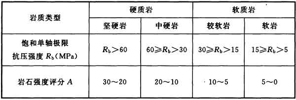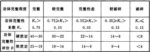 注:1 當(dāng)60MPa≥Rb>30MPa,巖體完整性程度與結(jié)構(gòu)面狀態(tài)評(píng)分之和大于65時(shí),按65評(píng)分;2 當(dāng)30MPa≥Rb>15MPa,巖體完整性程度與結(jié)構(gòu)面狀態(tài)評(píng)分之和大于55時(shí),按55評(píng)分;3 當(dāng)15MPa≥Rb>5MPa,巖體完整性程度與結(jié)構(gòu)面狀態(tài)評(píng)分之和大于40時(shí),按40評(píng)分;4 當(dāng)Rb≤5MPa,屬特軟巖,巖體完整性程度與結(jié)構(gòu)面狀態(tài)不參與評(píng)分。