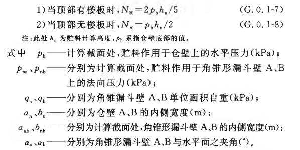 G.0.2對稱布置的矩形筒倉倉壁或角錐形漏斗壁,在貯料荷載、結(jié)構(gòu)自重等豎向荷載作用下,產(chǎn)生的豎向力或斜向力可按下列公式算: