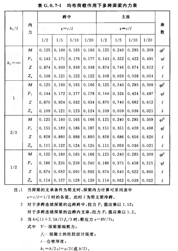 3髙壁淺倉或深倉倉壁可按平面深梁計算,略去漏斗壁的共同受力作用。平面深梁的計算表格見表G.0.6-1 表G.0.7-2。 4選擇鋼筋截面時,按平面內(nèi)彎曲算出的水平應力應與按表G.0.6-1 表G.0.7-2所計算出的水平力同時考慮。