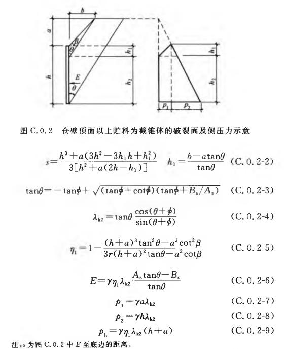 C.0.2當倉壁頂面以上貯料為截錐體,破裂面不通過倉中線(圖C.0.2)時,貯料作用于倉壁上的側(cè)壓力按下式計算: