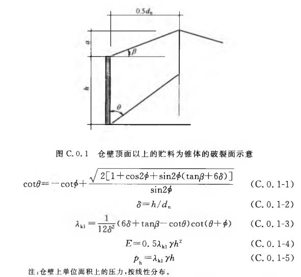 C.0.1當倉壁頂面以上的貯料為錐體,破裂面通過倉的中線(圖C.0.1)時,貯料作用于淺圓倉倉壁上的側(cè)壓力可按下式計算: