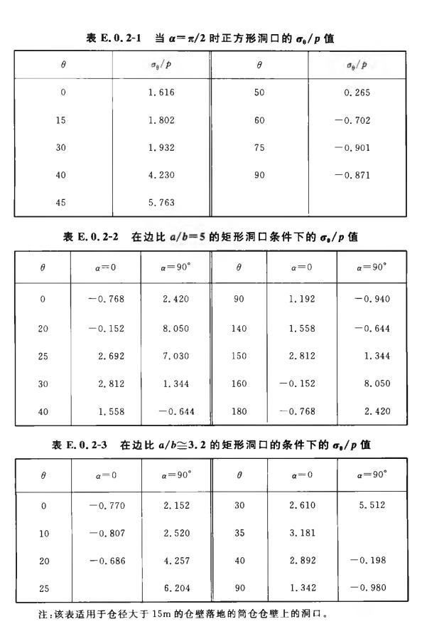 E.0.2倉壁周邊在拉、壓力作用下,正方形、矩形洞口應力參數(shù)如圖E.O.2及表E.0.2-1 表E.0.2-3所示。