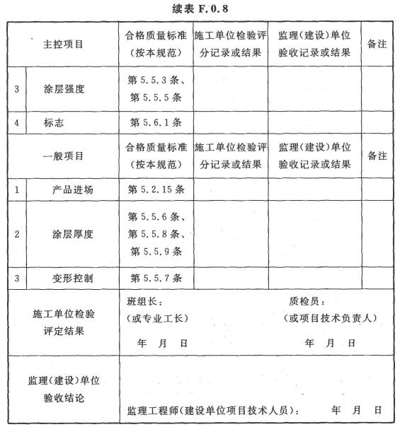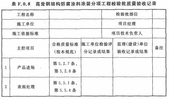 F.0.8 高聳鋼結(jié)構(gòu)防腐涂料涂裝分項工程檢驗批質(zhì)量驗收應(yīng)按表F.0.8進行記錄。