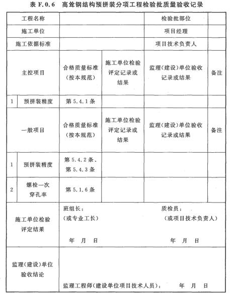 F.0.6 高聳鋼結(jié)構(gòu)預拼裝分項工程檢驗批質(zhì)量驗收應(yīng)按表F.0.6進行記錄。