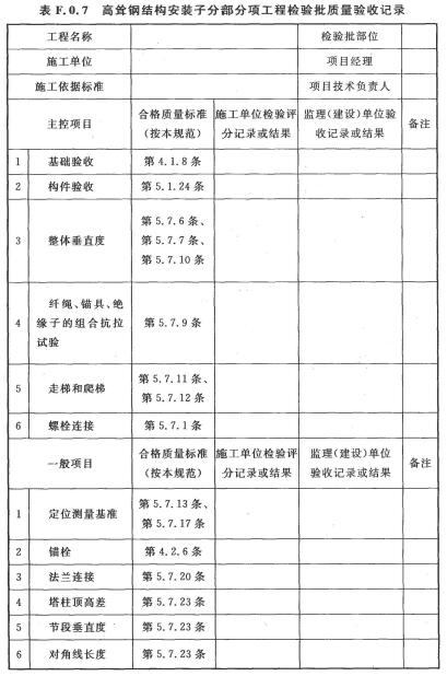 F.0.7高聳鋼結(jié)構(gòu)安裝子分部分項工程檢驗批質(zhì)量驗收應(yīng)按表F.0.7進行記錄。