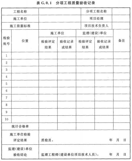 G.0.1分項工程質(zhì)量驗收應(yīng)按表G.0.1進行記錄。