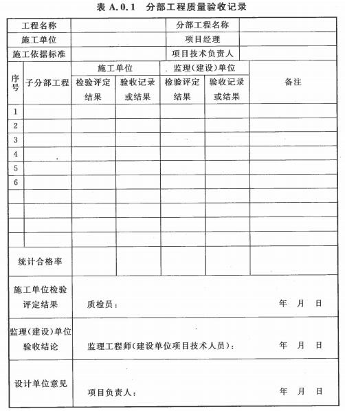 A.0.1分部工程質(zhì)量驗收應(yīng)按表A.0.1進行記錄。