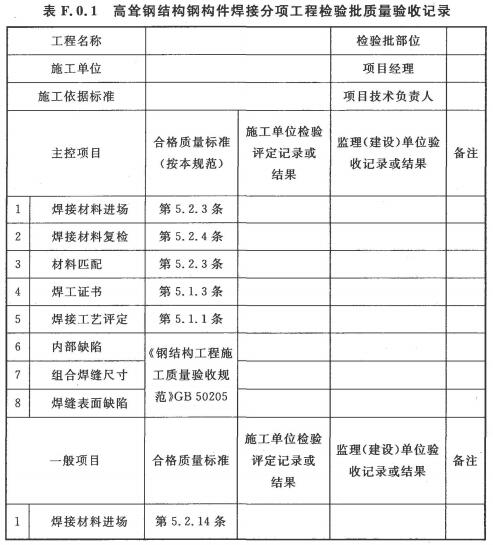 F.0.1高聳鋼結(jié)構(gòu)鋼構(gòu)件焊接分項工程檢驗批質(zhì)量驗收應(yīng)按表F.0.1進行記錄。