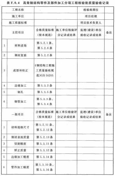 F.0.4 高聳鋼結(jié)構(gòu)零件及部件加工分項工程檢驗批質(zhì)量驗收應(yīng)按表F.0.4進行記錄。
