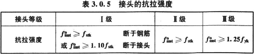 3.0.5 Ⅰ級(jí)、Ⅱ級(jí)、Ⅲ級(jí)接頭的抗拉強(qiáng)度必須符合表3.0.5的規(guī)定。