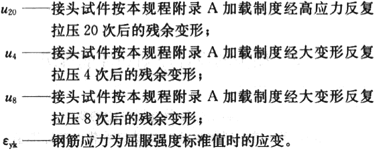 3.0.6 Ⅰ級(jí)、Ⅱ級(jí)、Ⅲ級(jí)接頭應(yīng)能經(jīng)受規(guī)定的高應(yīng)力和大變形反復(fù)拉壓循環(huán),且在經(jīng)歷拉壓循環(huán)后,其抗拉強(qiáng)度仍應(yīng)符合本規(guī)程表3.0.5的規(guī)定。