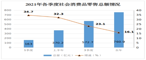 2021年,在市委市政府的堅強領(lǐng)導(dǎo)下,認真落實省委、省政府工作要求,科學統(tǒng)籌疫情防控和經(jīng)濟社會發(fā)展,消費市場總體保持恢復(fù)態(tài)勢。全年實現(xiàn)社會消費品零售總額760.9億元,同比增長16.1%,兩年平均增速為5.2%。