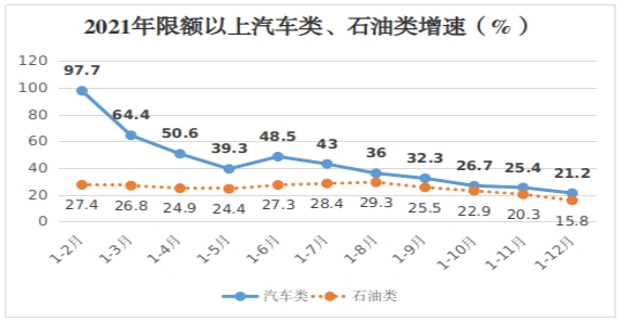 從增速上看,石油類同比增長15.8%,比2020年提高38.9個百分點。后4個月增速逐月回落,由最高29.3%逐步回落到1-12月的15.8%,回落了13.5個百分點。汽車類增速同比增長21.2%,比2020年提高20.6個百分點。受芯片短缺、原材料上漲等因素影響,汽車類商品供貨不足,導(dǎo)致汽車類增速持續(xù)回落,增速由最高97.7%逐步回落到1-12月的21.2%,回落了76.5個百分點。