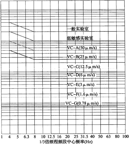 A.0.1 拉絲塔的容許振動參數(shù)可按精密設(shè)備、儀器容許振動通用標準曲線(圖A.0.1)中VC-B(25μm/s)曲線確定。