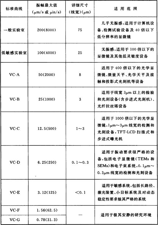 A.0.2 精密設(shè)備、儀器容許振動標準曲線的應(yīng)用應(yīng)符合表A.0.2的要求。