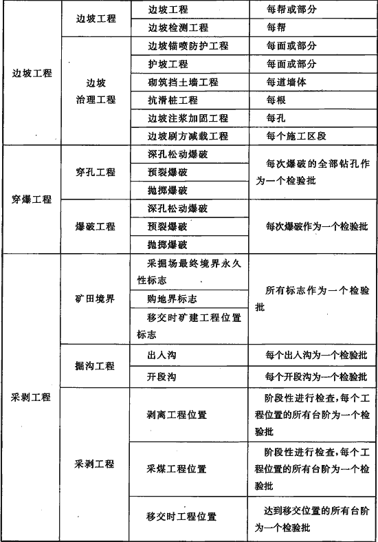 4 檢驗(yàn)批應(yīng)根據(jù)施工、質(zhì)量控制和專業(yè)驗(yàn)收需要劃定。各露天煤礦可根據(jù)建設(shè)實(shí)際需要劃定適應(yīng)的檢驗(yàn)批。