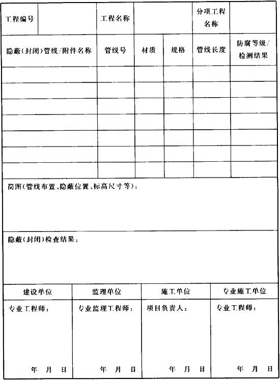 10.0.5 管道工程質(zhì)量驗(yàn)收時(shí),應(yīng)核查施工現(xiàn)場(chǎng)及施工過程中形成的各種施工現(xiàn)場(chǎng)技術(shù)管理文件、施工質(zhì)量記錄等工程資料,資料的格式要求宜符合本規(guī)范附錄A~附錄E的有關(guān)規(guī)定。