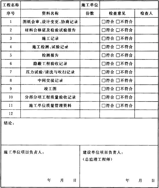 3.0.3 管道工程施工過程應(yīng)完成各類施工技術(shù)文件、施工記錄、檢驗(yàn)報(bào)告、質(zhì)量驗(yàn)收記錄等工程驗(yàn)收工作。