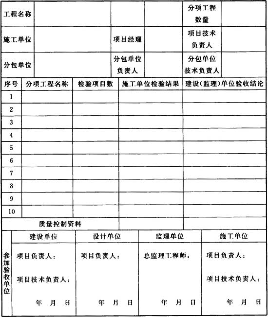 10.0.3 分部(子分部)工程質(zhì)量驗(yàn)收應(yīng)符合下列規(guī)定,并應(yīng)按本規(guī)范表D的格式填寫驗(yàn)收記錄: