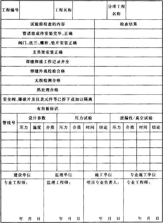 表A.0.11 工業(yè)有色金屬管道系統(tǒng)壓力試驗(yàn)和泄漏性試驗(yàn)記錄