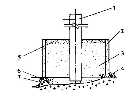圖E.0.1 鋼筋混凝土套箱穩(wěn)樁示意圖1-預(yù)制樁;2―鋼筋混凝土套箱;3-填充砂;4-土工織物;5-封固用袋裝混凝土或灌注混凝土;6-壓實(shí)用砂袋;7-壓實(shí)用袋裝混凝土或拋石塊