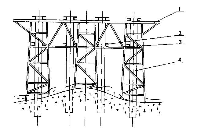 圖B.0.8 支撐式鋼桁架平臺(tái)結(jié)構(gòu)示意圖1-上平臺(tái);2-樁定位構(gòu)件;3-下平臺(tái);4-工程樁