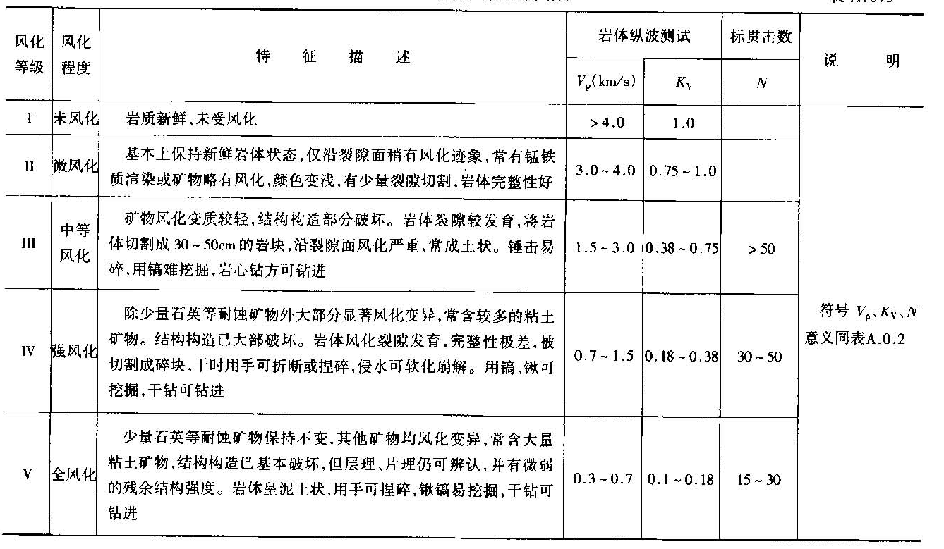 A.0.2 硬質(zhì)巖石、巖體風(fēng)化程度的劃分,見(jiàn)表A.0.2。