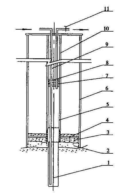 圖B.0.14 定位器安裝及壓力注漿示意圖1-錨桿;2-基巖面找平混凝土;3-封孔水泥漿;4-定位器;5-導(dǎo)管;6-預(yù)制樁;7-密封橡膠圈或充氣囊;8-加壓鋼板;9-壓漿管;10-出漿管;11-閥門(mén)