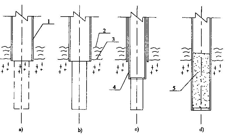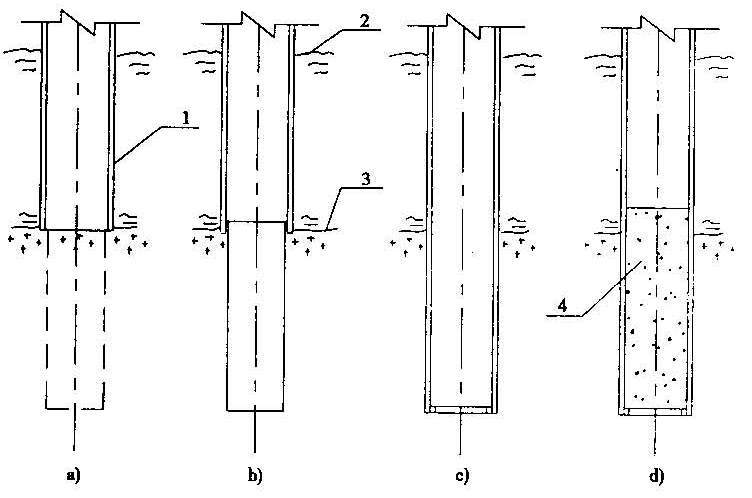 圖B.0.12 預(yù)制型植入嵌巖樁采用鋼護(hù)筒鉆巖打樁錨固法施工示意圖a)鋼護(hù)筒定位沉放;b)鉆孔;c)打入預(yù)制樁;d)清孔、灌注水下混凝土錨固,拔出鋼護(hù)筒