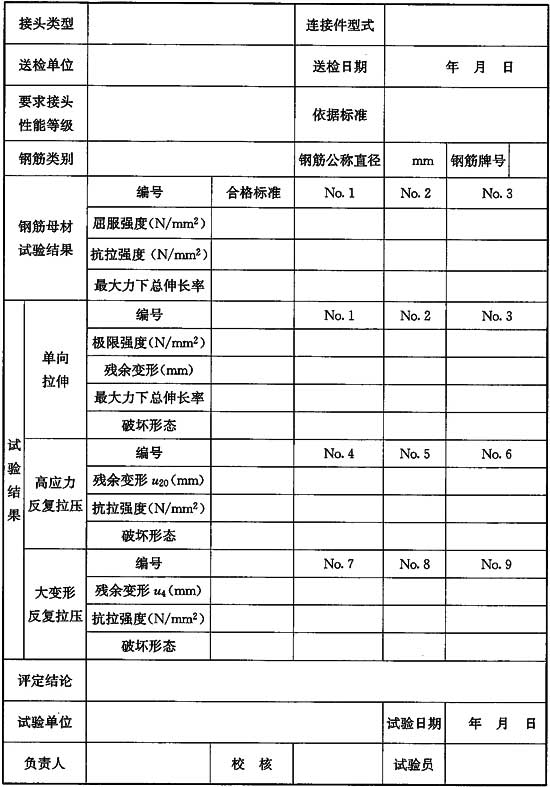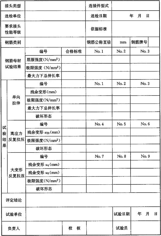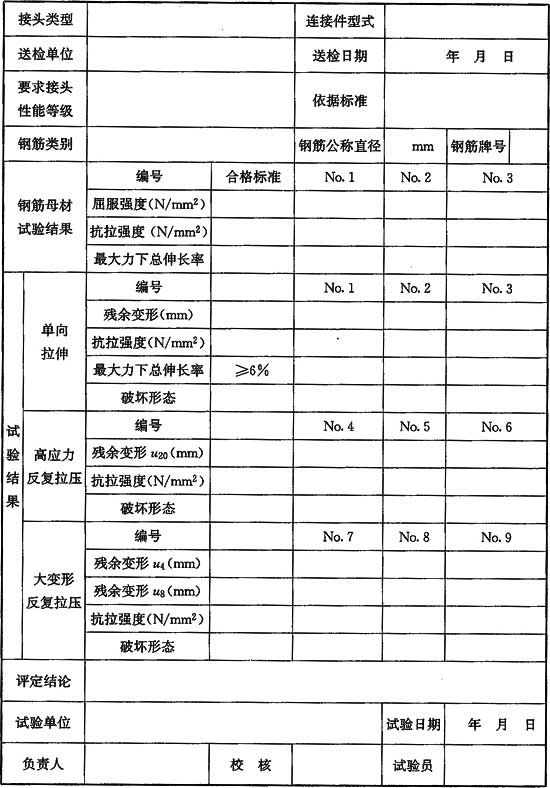 5.0.4 型式檢驗(yàn)應(yīng)詳細(xì)記錄連接件和接頭參數(shù),宜按本規(guī)程附錄B的格式出具檢驗(yàn)報(bào)告和評(píng)定結(jié)論。