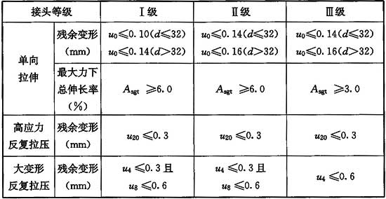3.0.4 接頭應(yīng)根據(jù)極限抗拉強(qiáng)度、殘余變形、最大力下總伸長(zhǎng)率以及高應(yīng)力和大變形條件下反復(fù)拉壓性能,分為Ⅰ級(jí)、Ⅱ級(jí)、Ⅲ級(jí)三個(gè)等級(jí),其性能應(yīng)分別符合本規(guī)程第3.0.5條~第3.0.7條的規(guī)定。