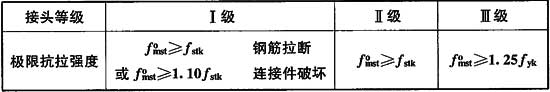 3.0.5 Ⅰ級(jí)、Ⅱ級(jí)、Ⅲ級(jí)接頭的極限抗拉強(qiáng)度必須符合表3.0.5的規(guī)定。