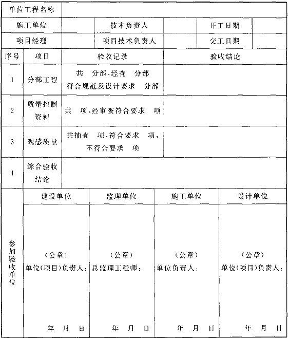 C.0.1 單位工程質(zhì)量驗(yàn)收宜按表C.0.1進(jìn)行記錄。
