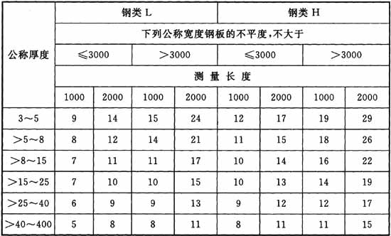 2.0.6 鋼板的技術(shù)要求應(yīng)符合現(xiàn)行國(guó)家標(biāo)準(zhǔn)《熱軋鋼板和鋼帶的尺寸、外形、重量及允許偏差》GB/T 709、《鍋爐和壓力容器用鋼板》GB 713、《低合金高強(qiáng)度結(jié)構(gòu)鋼》GB/T 1591、《高強(qiáng)度結(jié)構(gòu)用調(diào)質(zhì)鋼板》GB/T 16270、《壓力容器用調(diào)質(zhì)高強(qiáng)度鋼板》GB 19189、《熱軋鋼板表面質(zhì)量的一般要求》GB/T 14977、《承壓設(shè)備用不銹鋼鋼板及鋼帶》GB/T 24511和《不銹鋼和耐熱鋼 牌號(hào)及化學(xué)成分》GB/T 20878的有關(guān)規(guī)定。鋼板厚度允許偏差和鋼板不平度允許偏差應(yīng)符合表2.0.6-1和表2.0.6-2的規(guī)定。