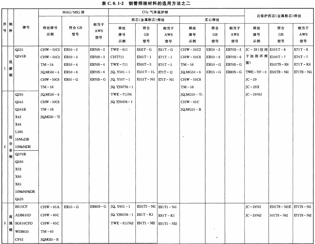 C.0.1 鋼管焊接材料的選用應(yīng)符合表C.0.1-1、表C.0.1-2的規(guī)定。