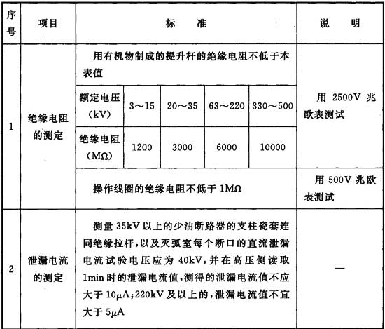 1 測量絕緣電阻,應(yīng)按制造廠的規(guī)定執(zhí)行;絕緣拉桿的絕緣電阻值,在常溫下不應(yīng)低于本規(guī)范表A.0.5中序號1的規(guī)定。