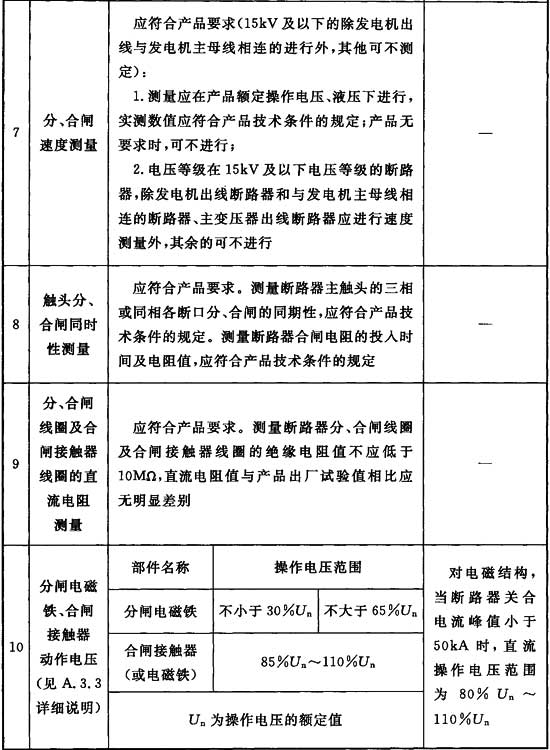 8 測量分、合閘線圈的絕緣電阻值,不應(yīng)低于10MΩ;直流電阻與產(chǎn)品出廠試驗值相比應(yīng)無明顯差別。