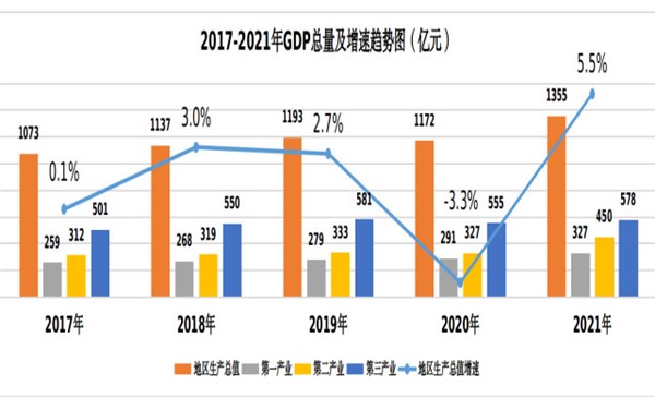 根據(jù)盟市生產(chǎn)總值統(tǒng)一核算結(jié)果,2021年全市地區(qū)生產(chǎn)總值為1354.8億元,比上年增長5.5%,兩年平均增長1.0%。其中,第一產(chǎn)業(yè)增加值327.1億元,比上年增長7.1%,兩年平均增長3.6%;第二產(chǎn)業(yè)增加值450.2億元,比上年增長2.9%,兩年平均下降1.7%;第三產(chǎn)業(yè)增加值577.5億元,比上年增長6.3%,兩年平均增長1.2%。大牛工程師