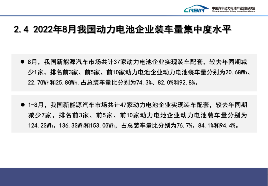 8月,我國(guó)新能源汽車市場(chǎng)共計(jì)37家動(dòng)力電池企業(yè)實(shí)現(xiàn)裝車配套,較去年同期減少1家。排名前3家、前5家、前10家動(dòng)力電池企業(yè)動(dòng)力電池裝車量分別為20.6GWh、22.7GWh和25.8GWh,占總裝車量比分別為74.3%、82.0%和92.8%。1-8月,我國(guó)新能源汽車市場(chǎng)共計(jì)47家動(dòng)力電池企業(yè)實(shí)現(xiàn)裝車配套,較去年同期減少7家,排名前3家、前5家、前10家動(dòng)力電池企業(yè)動(dòng)力電池裝車量分別為124.2GWh、136.3GWh和153.0GWh,占總裝車量比分別為76.7%、84.1%和94.4%。