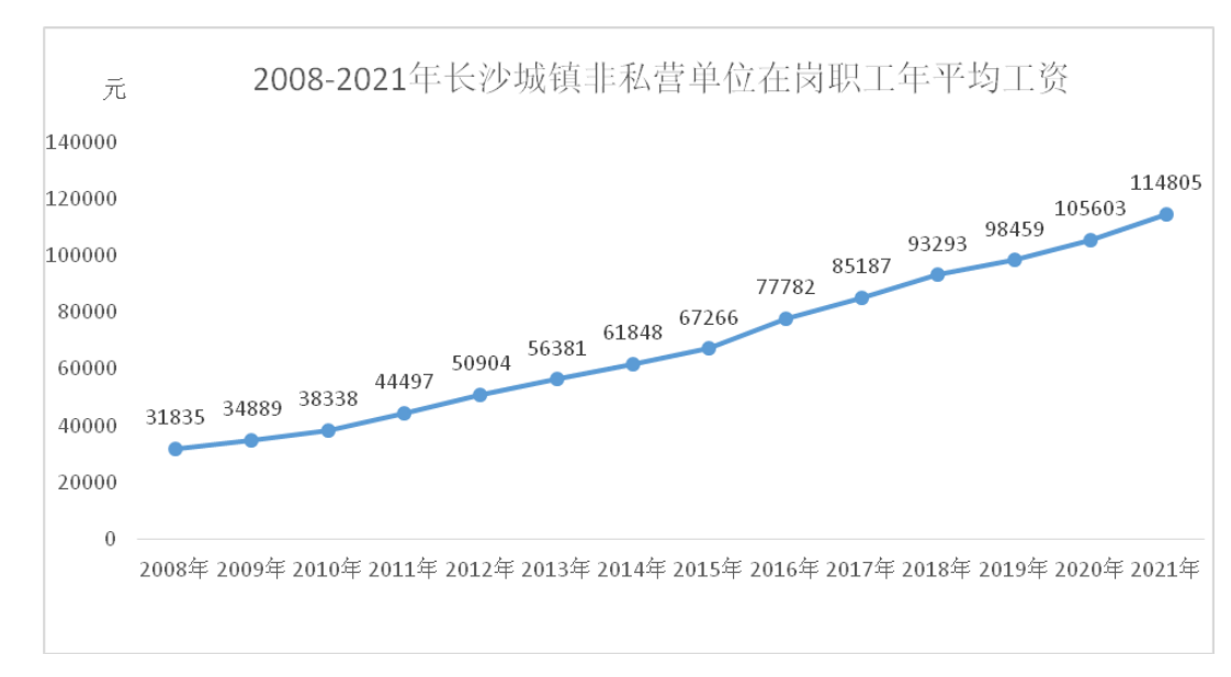 2021年長(zhǎng)沙城鎮(zhèn)非私營(yíng)單位在崗職工年平均工資114805元,增長(zhǎng)8.7%。
